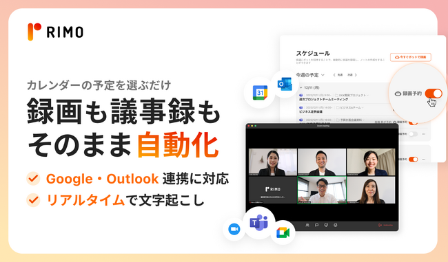 Rimo合同会社(本社:東京都渋谷区、代表:相川 直視)は、AI議事録サービス「Rimo Voice」の新機能『Rimo議事録Bot』を正式リリースしました。録画予約したオンライン会議にBotが参加し、完全自動で会議の録画・議事録作成を実行します。リアルタイム文字起こし、要約、話者分離、フォルダ振り分けによる管理の全てを自動化し、ユーザーの手間を大幅に削減することに成功しました。