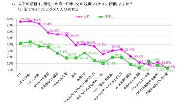 TOP3はニオイとフケで約90%。相手が男性の場合と違い、口臭が1位に。