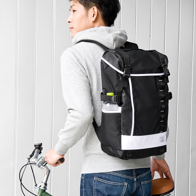 形状は、ボディを四角くしデッドスペースを軽減したスクエアデザインです。ファイルや雑誌など角のあるアイテムを、きれいに収納できて収納物が見やすく、出し入れのしやすさも向上します。フラップ部分とフロント部分にはカーボンPUコーティングを施し、雨や汚れに強く防水性に優れており、耐摩擦性にも優れています。内装は15.6型までのノートパソコン収納ポケット、10.1型までのタブレット収納ポケット、A4雑誌が収納できる多目的ポケットがあり、サイドにはペットボトルや折り畳み傘などを収納可能なポケット付きです。