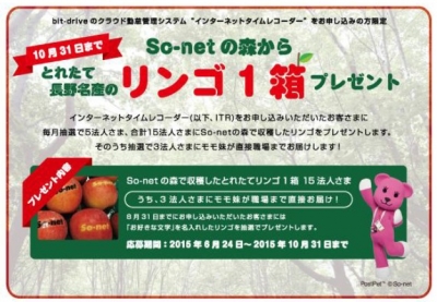 「So-netの森」(※)で収穫したリンゴ(1箱)をプレゼントします。さらに抽選で3法人にはモモ妹が直接職場